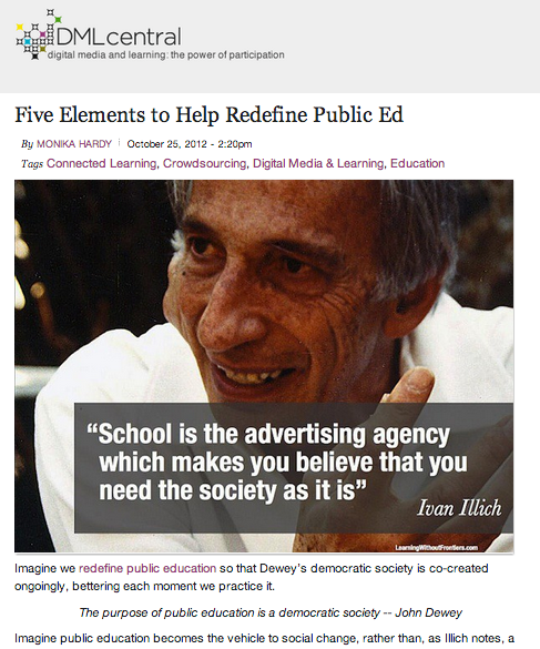 Our latest post on dmlcentral.net, five elements we believe are key to redefining public ed in a community (the chapters of our little book). Click here to read the rest of the post.